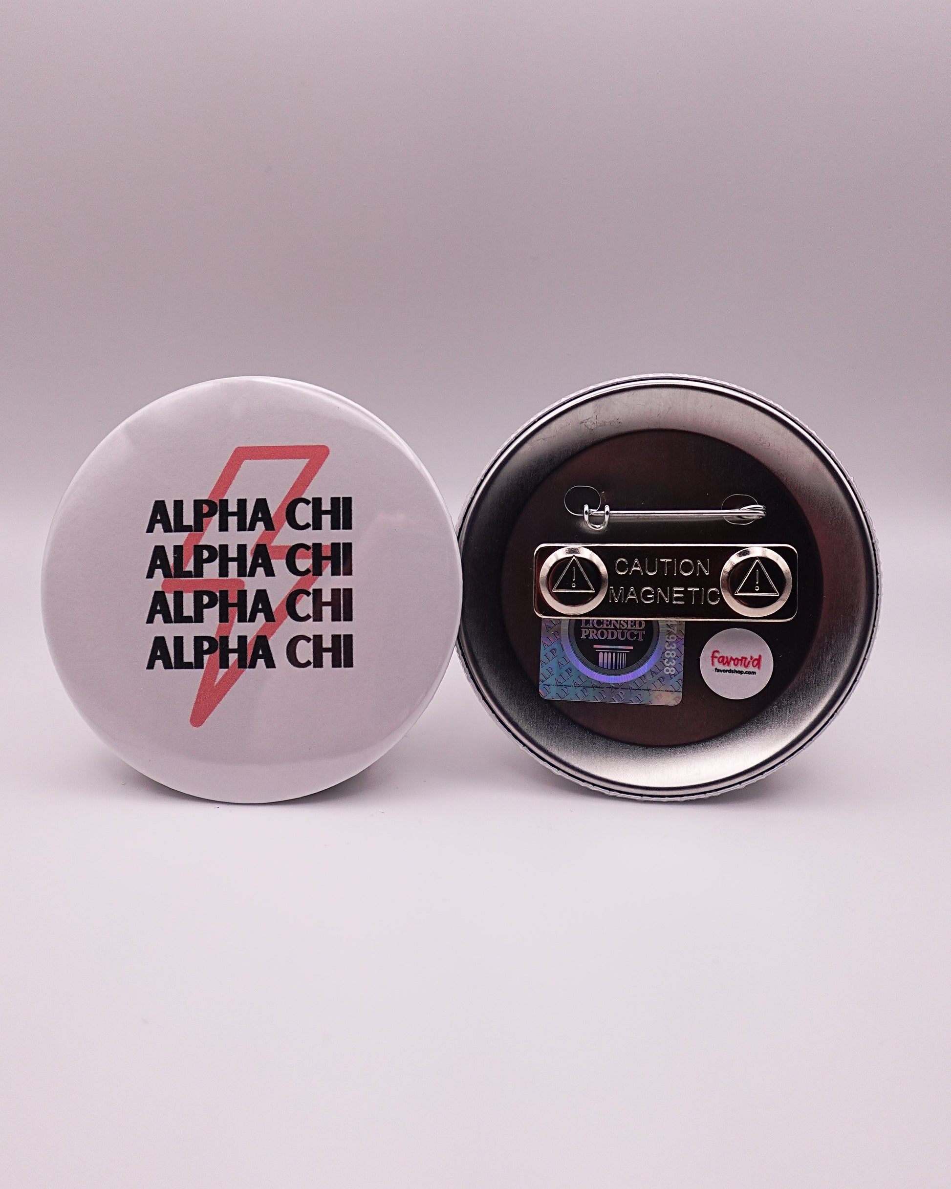 Alpha Chi Omega Lightning Bolt Button — spark your A Chi O spirit with this bold and fun button! Rock it on game days, pin it to your backpack, or add it to your favorite decor. A must-have for showing your Alpha Chi Omega pride anywhere you go.