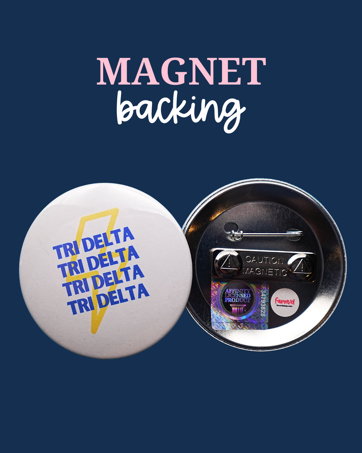 Delta Delta Delta Lightning Bolt Button — spark your Tri Delta spirit with this bold and fun button! Rock it on game days, pin it to your backpack, or add it to your favorite decor. A must-have for showing your Tri Delta pride anywhere you go.